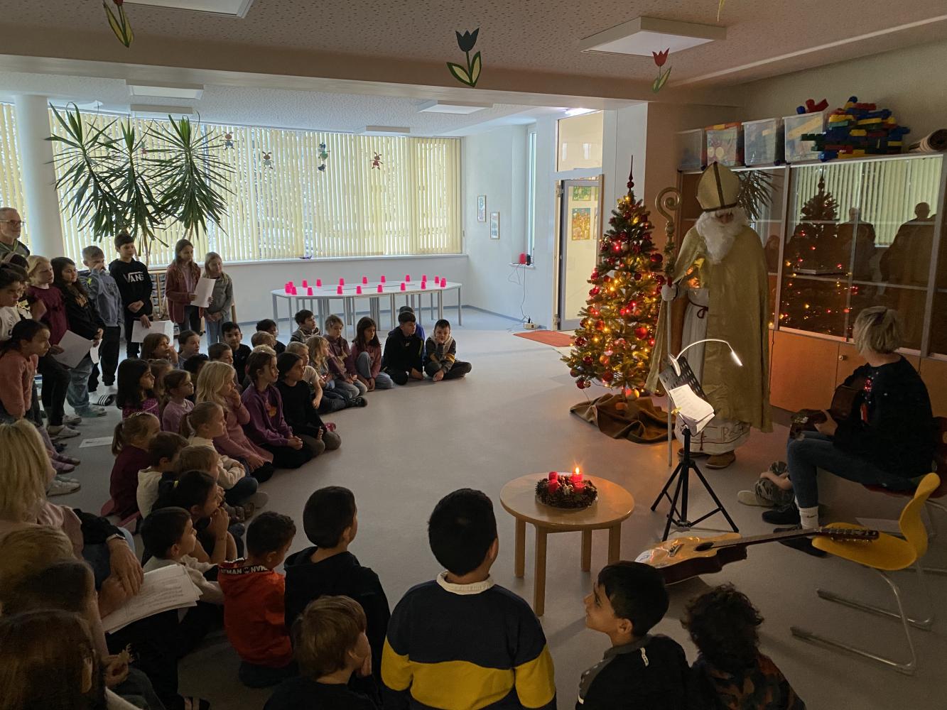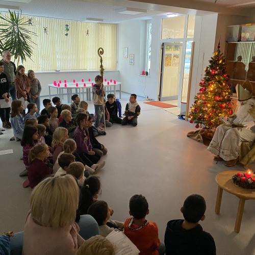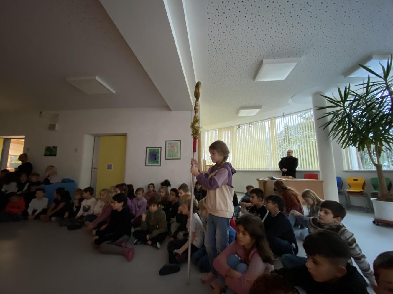 Zum Dank an Bischof Nikolaus lasen einige Kinder ein Gedicht vor, wurde gemeinsam gesungen und zum Abschied boten die Kinder der dritten Klasse dem Nikolaus noch einen Becher Rhythmus dar.