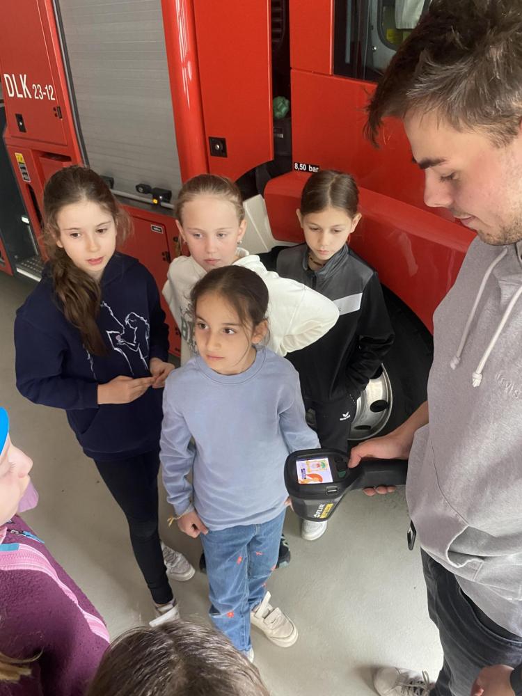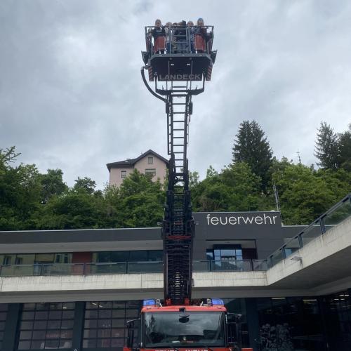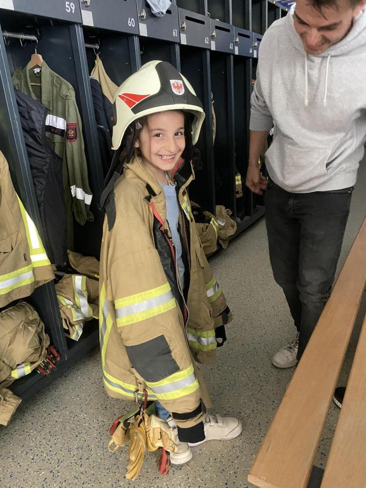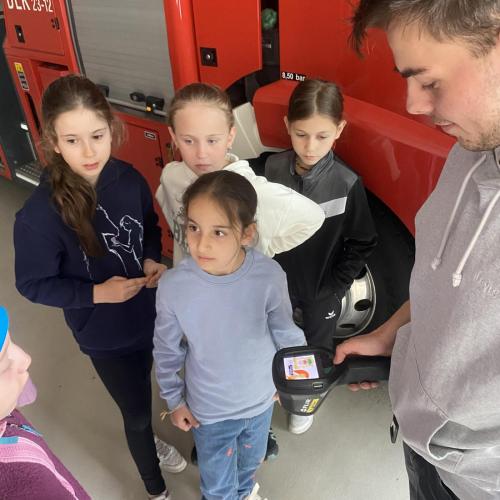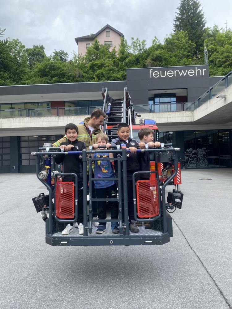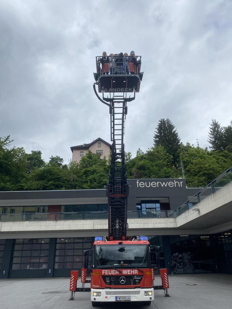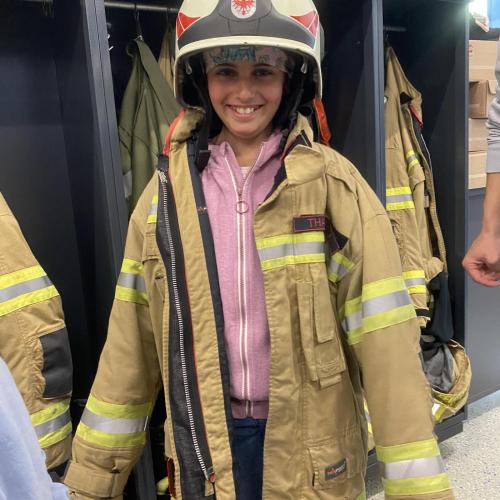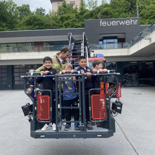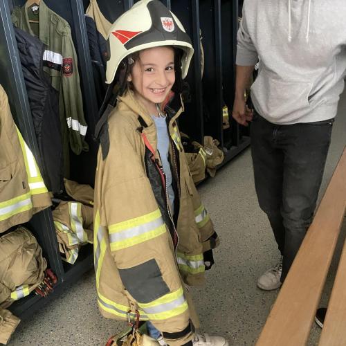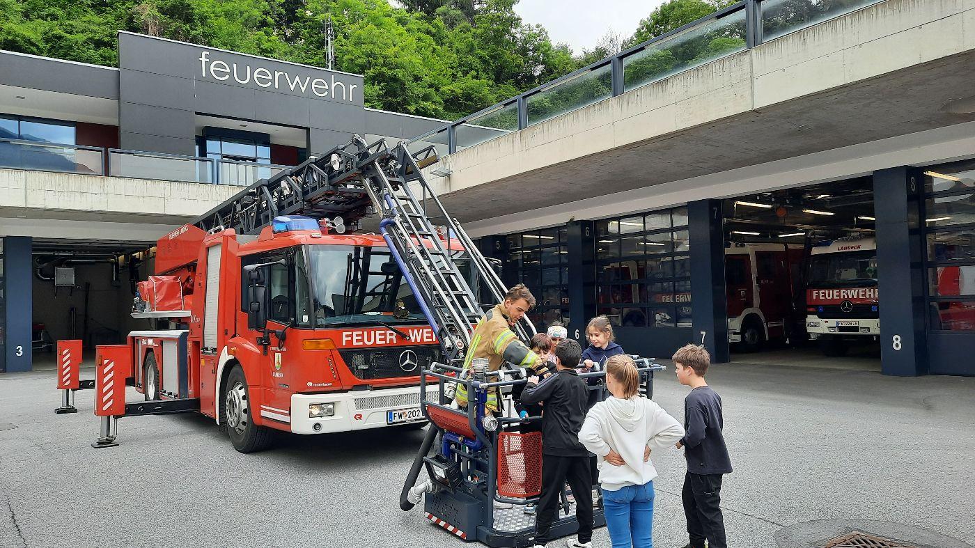 Um 10.00 Uhr wurden wir von Florian Stecher (Kommandant - Stellvertreter) und Jakob Thaler (Jugendarbeit) vor dem Eingang erwartet. Nach einer kurzen Einführung im Lehrsaal ging es weiter in die Einsatzzentrale. Gleich darauf wechselten wir in den unteren Stock zu den Spinden. Dort schlüpften die Kinder in die schweren Einsatzjacken und die Helme. Nun durften wir endlich zu den Einsatzfahrzeugen. Dort gab es vielen Geräte, Kupplungen, Schläuche und Werkzeuge zu bestaunen. Vieles durfte angefasst, gehoben.... und auch wieder verräumt werden. Natürlich durften sich die Kinder auch in die Fahrzeuge setzen und sich wie ein Feuerwehrmann/eine Feuerwehrfrau fühlen. Es wurde auf jede Frage der Kinder eingegangen. Zum Schluss kam das Highlight: die Drehleiter wurde in den Hof gefahren. Alle Kinder wagten sich in den Korb und fuhren bis zu 30 Meter in die Höhe.