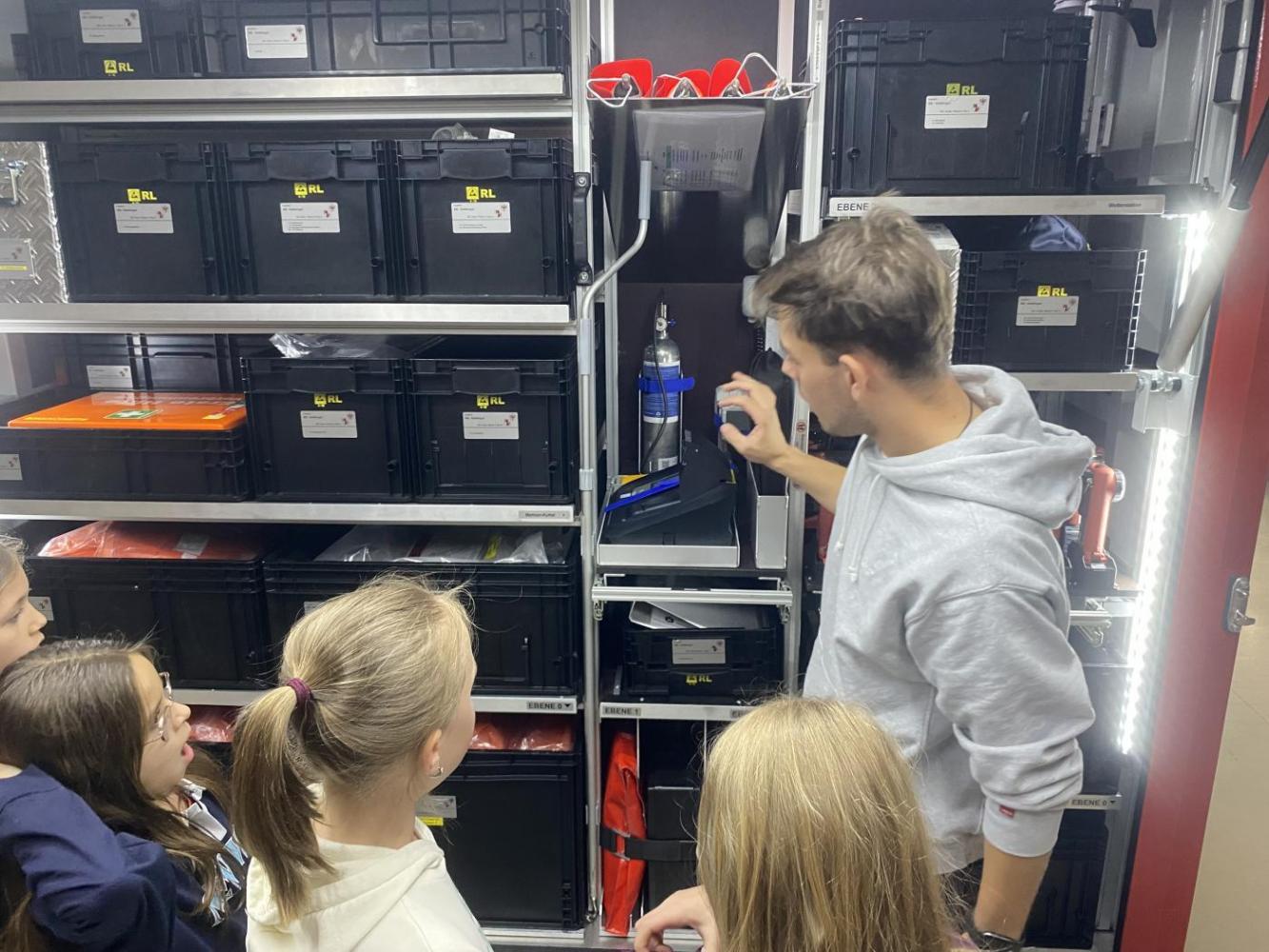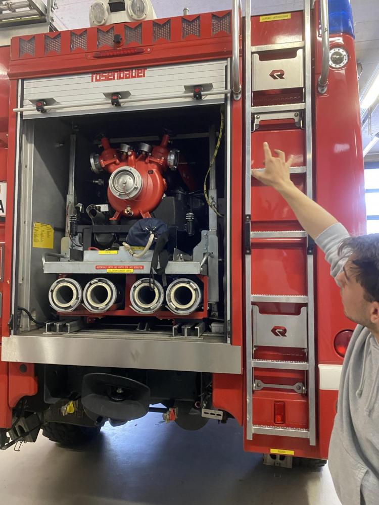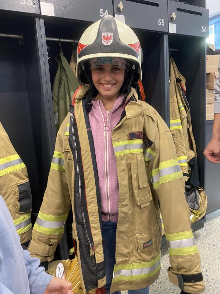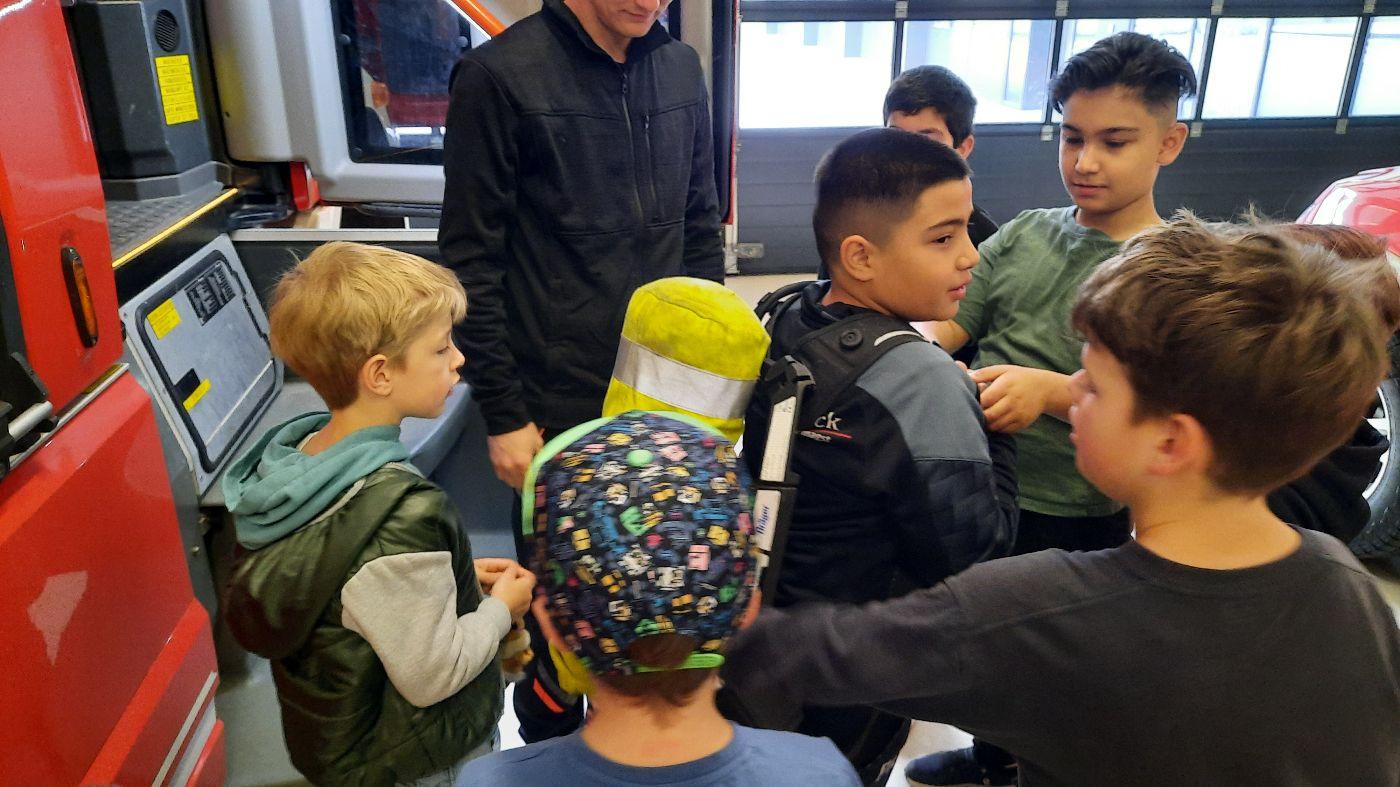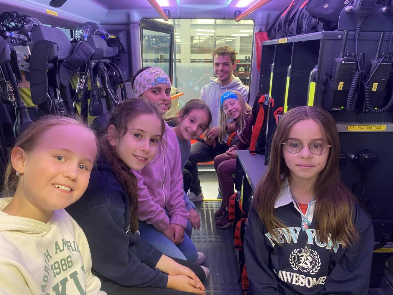 Um 10.00 Uhr wurden wir von Florian Stecher (Kommandant - Stellvertreter) und Jakob Thaler (Jugendarbeit) vor dem Eingang erwartet. Nach einer kurzen Einführung im Lehrsaal ging es weiter in die Einsatzzentrale. Gleich darauf wechselten wir in den unteren Stock zu den Spinden. Dort schlüpften die Kinder in die schweren Einsatzjacken und die Helme. Nun durften wir endlich zu den Einsatzfahrzeugen. Dort gab es vielen Geräte, Kupplungen, Schläuche und Werkzeuge zu bestaunen. Vieles durfte angefasst, gehoben.... und auch wieder verräumt werden. Natürlich durften sich die Kinder auch in die Fahrzeuge setzen und sich wie ein Feuerwehrmann/eine Feuerwehrfrau fühlen. Es wurde auf jede Frage der Kinder eingegangen. Zum Schluss kam das Highlight: die Drehleiter wurde in den Hof gefahren. Alle Kinder wagten sich in den Korb und fuhren bis zu 30 Meter in die Höhe.