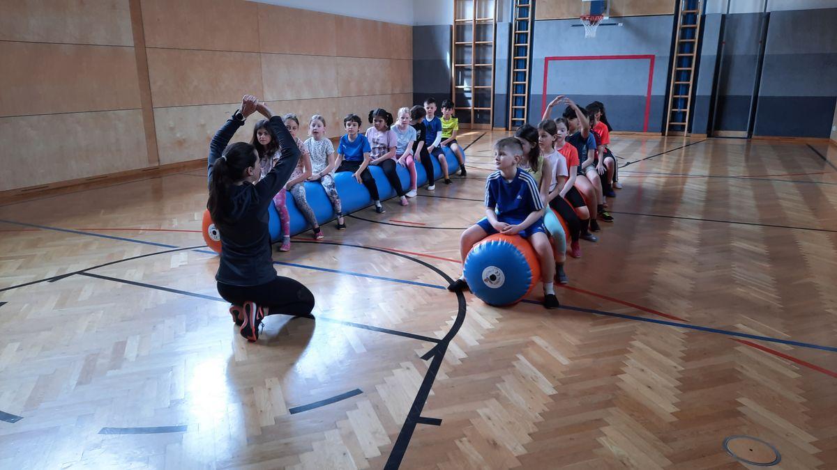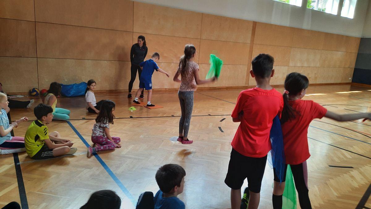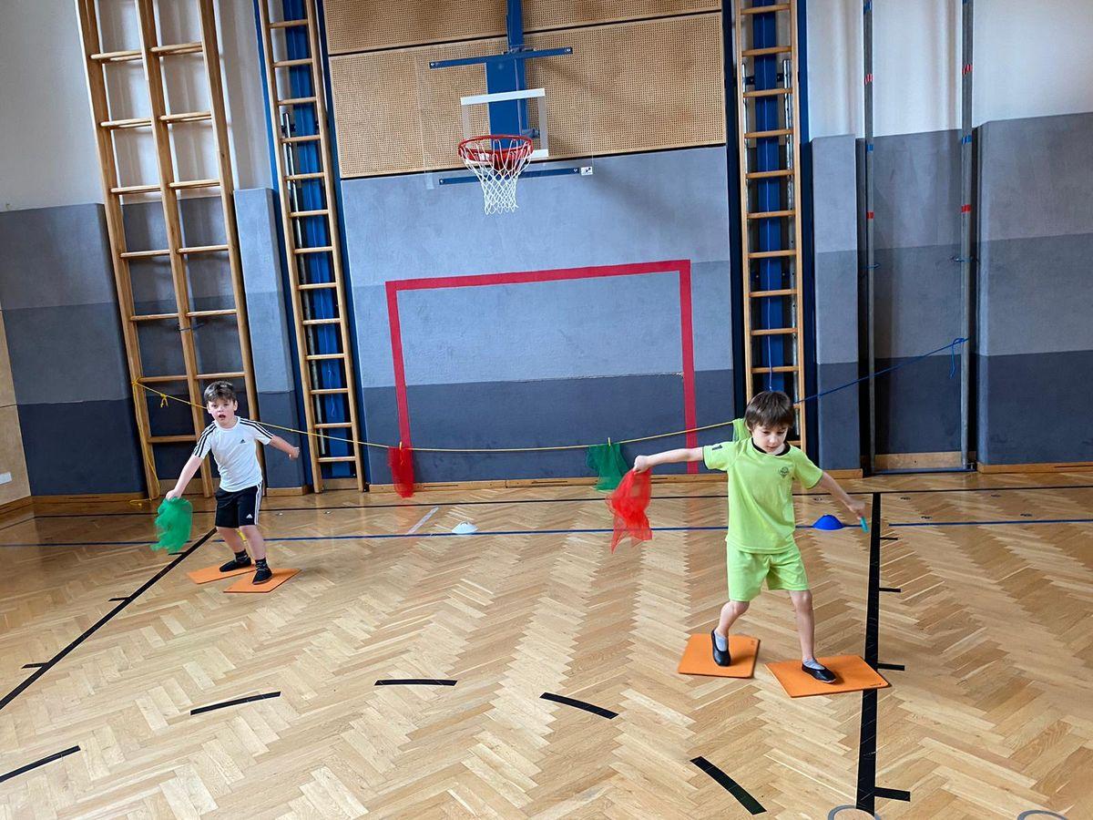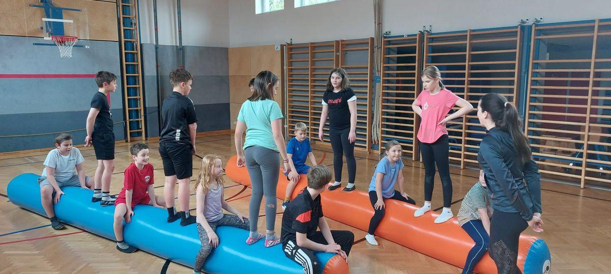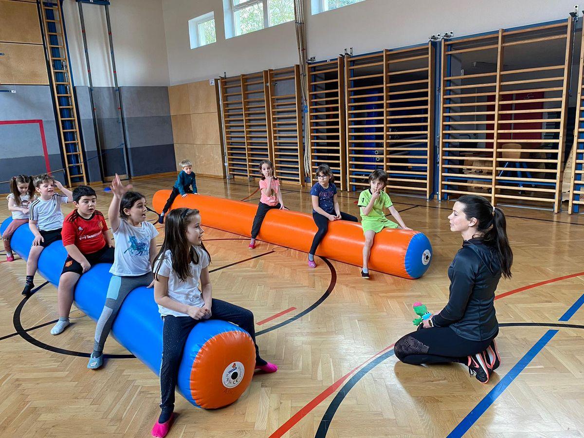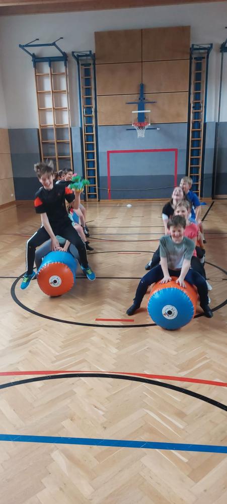 Am Freitag, den 14. April besuchte uns Hopsi Hopper mit Bianca. Die Kinder absolvierten Staffelläufe mit Rollbrettern und Teppichfliesen und mussten Tücher und Reissäckchen transportieren. Der Abschluss bildeten Geschicklichkeitsübungen auf der großen Rolle. Es war wieder eine coole Turnstunde.
