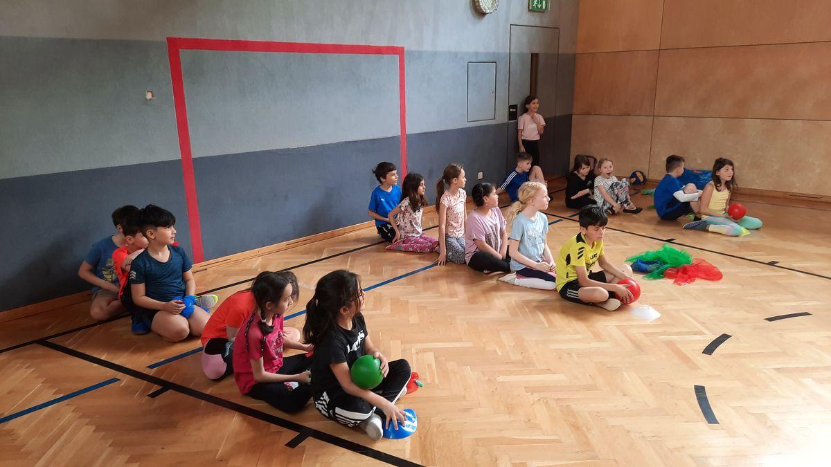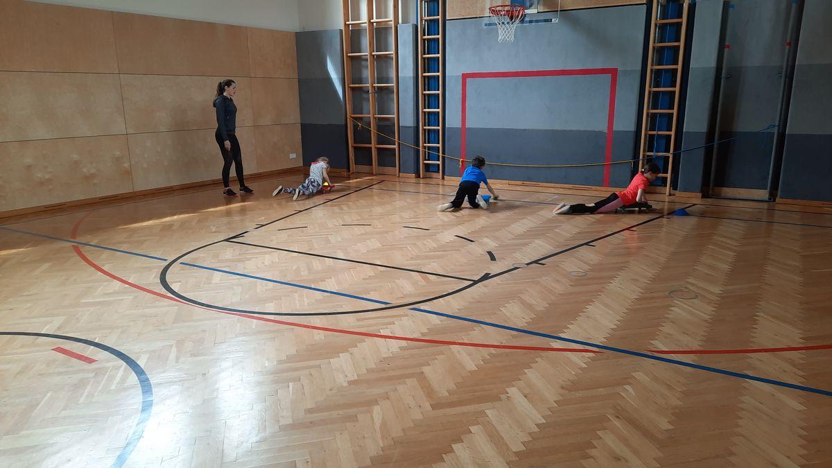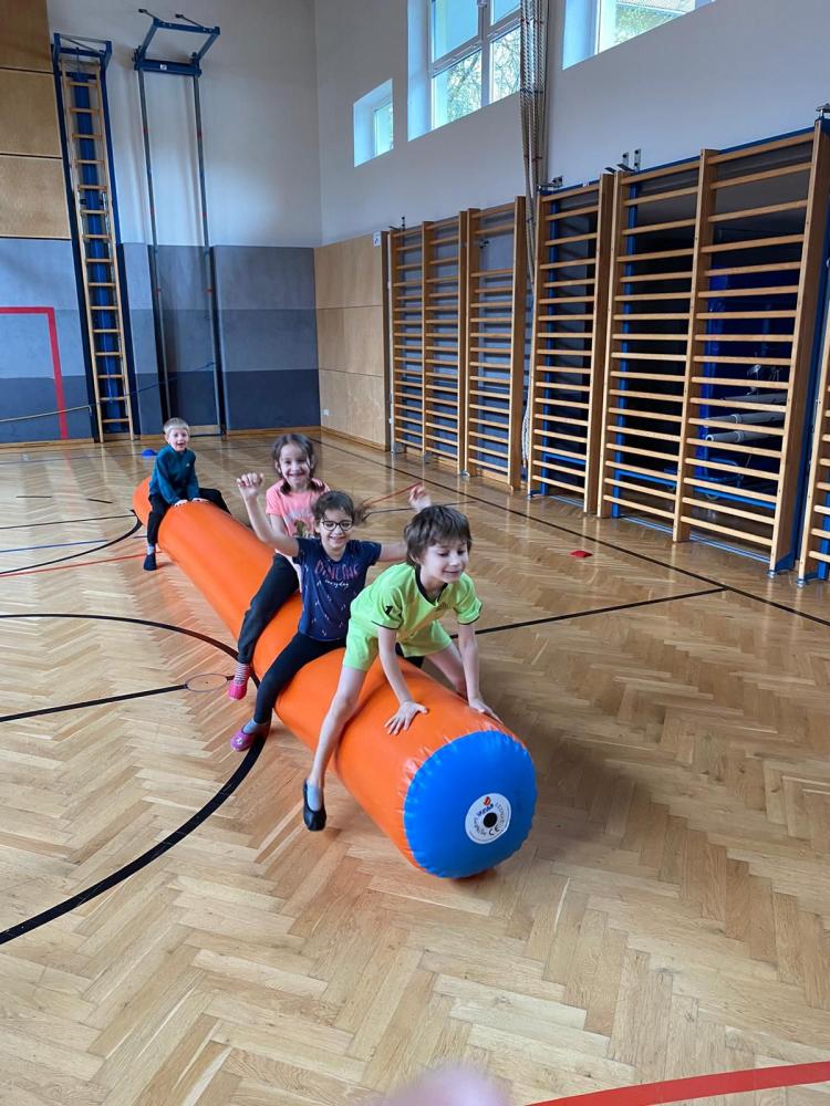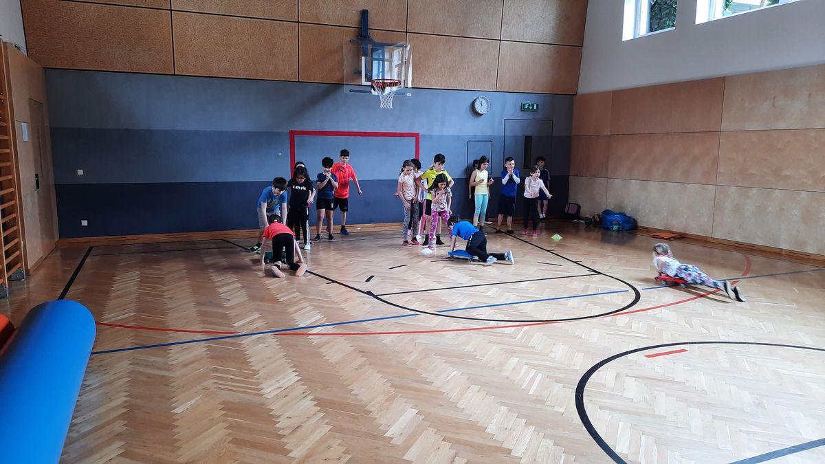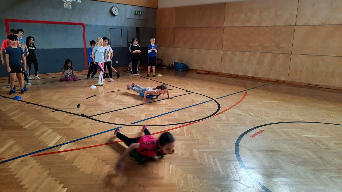 Am Freitag, den 14. April besuchte uns Hopsi Hopper mit Bianca. Die Kinder absolvierten Staffelläufe mit Rollbrettern und Teppichfliesen und mussten Tücher und Reissäckchen transportieren. Der Abschluss bildeten Geschicklichkeitsübungen auf der großen Rolle. Es war wieder eine coole Turnstunde.
