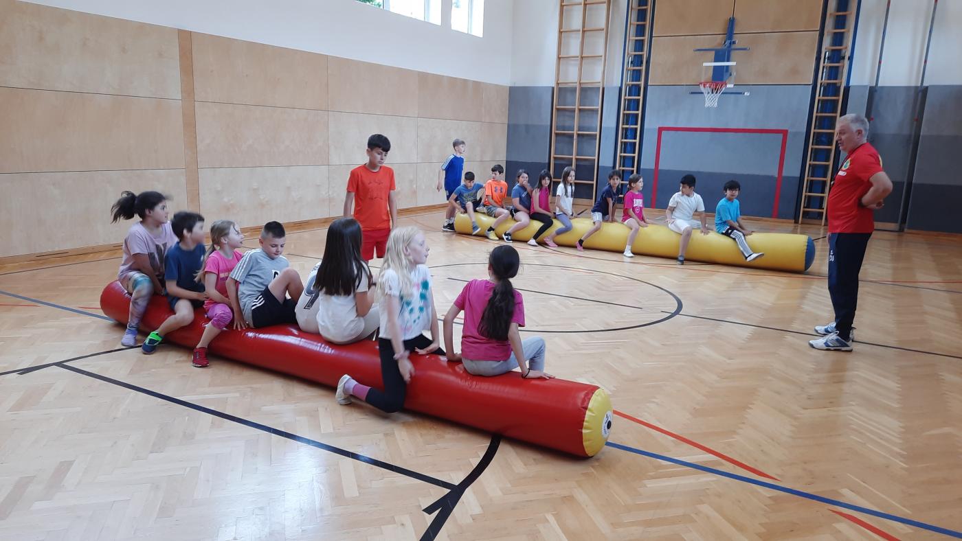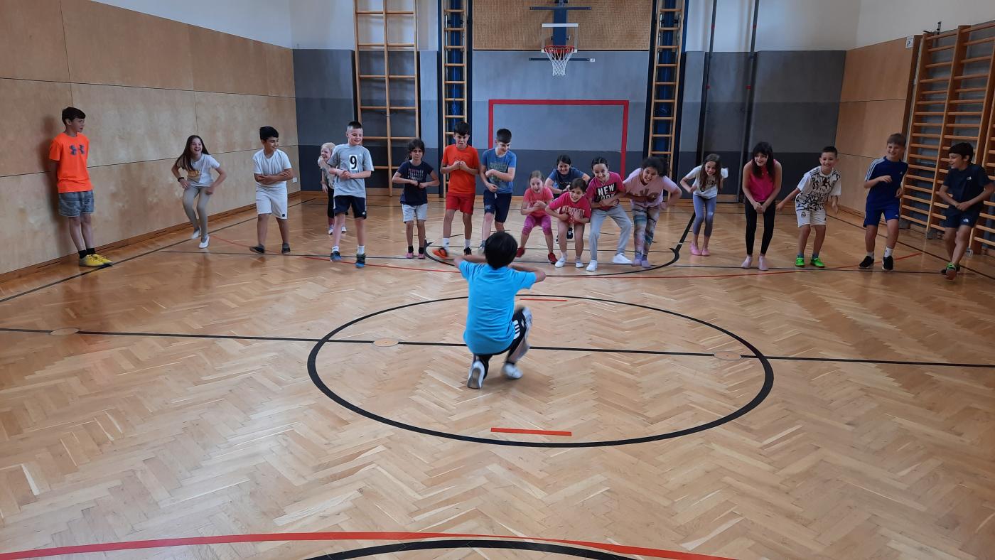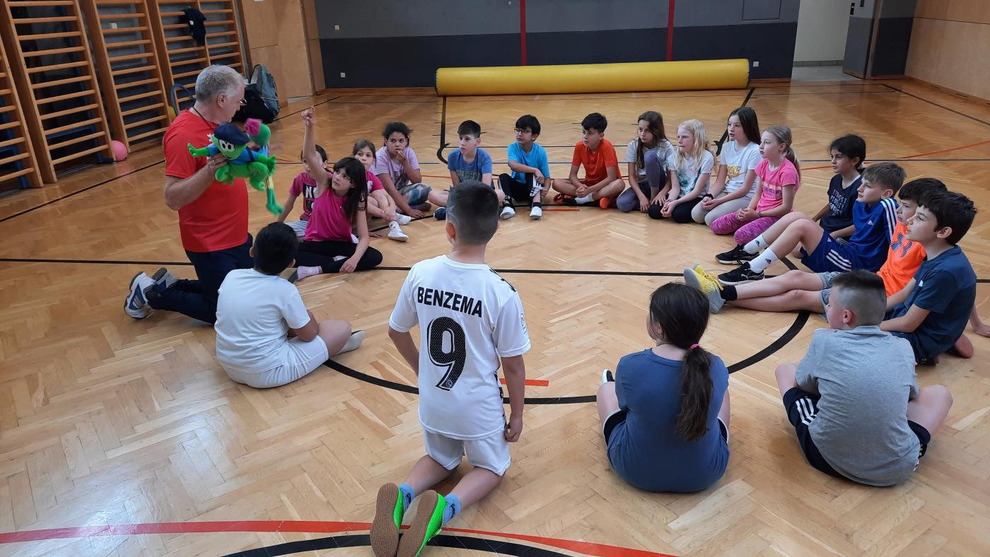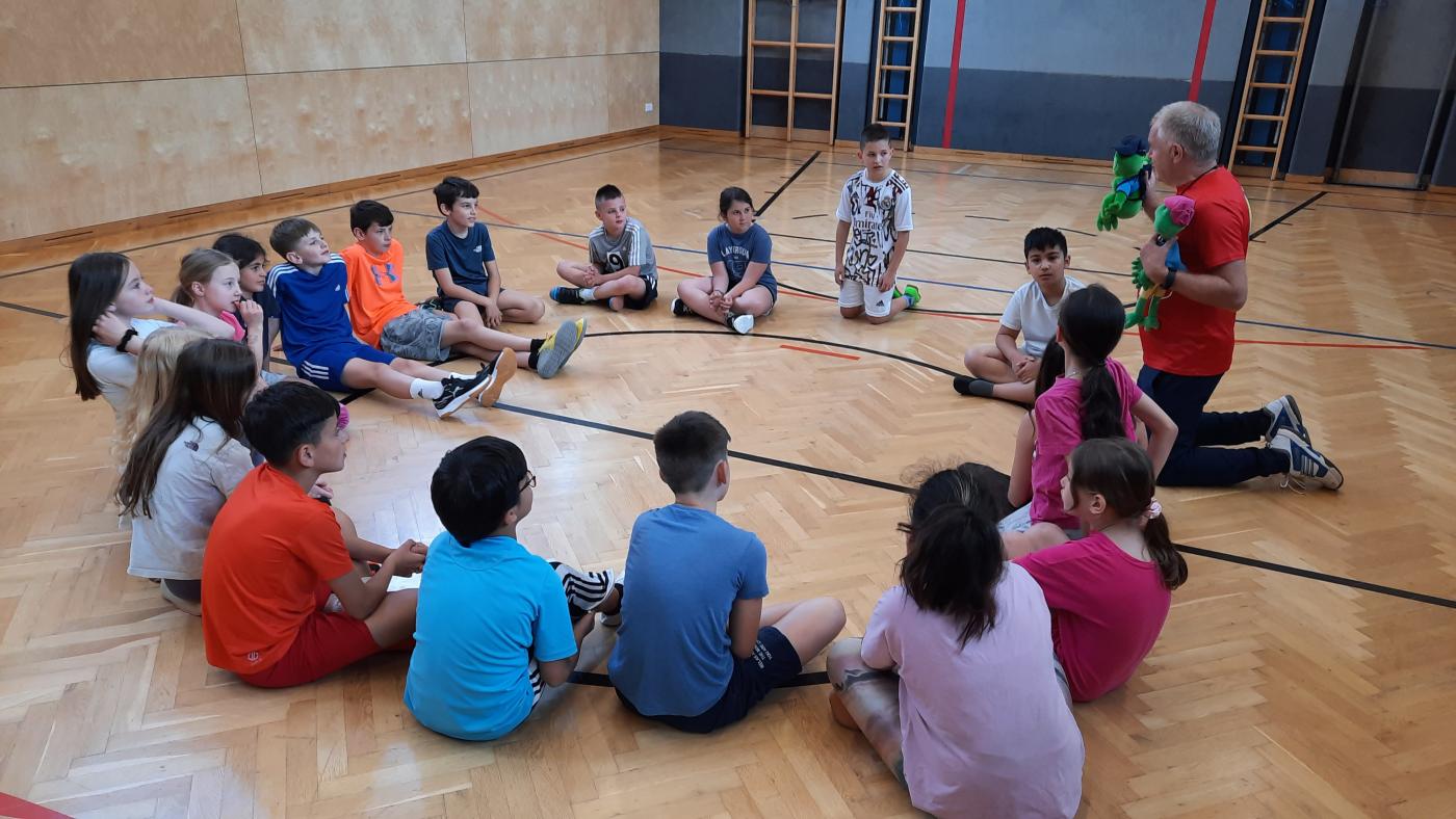 Am Donnerstag, den 23. Mai, besuchte uns Christian mit Hopsi Hopper und Hubsi Hopper. Aufgewärmt wurde mit einem Konzentrationsspiel. Im Anschluss daran blickten die Kinder in einen Spiegel und mussten alle Bewegungen des "Spiegels" nachmachen. Zum Abschluss kam noch die Rolle zum Einsatz.