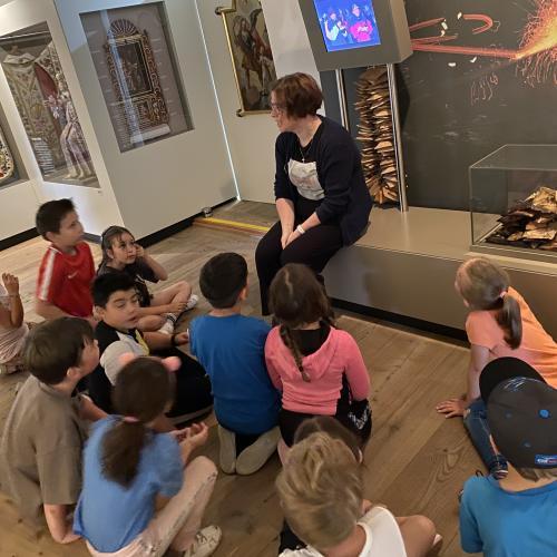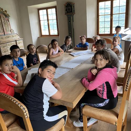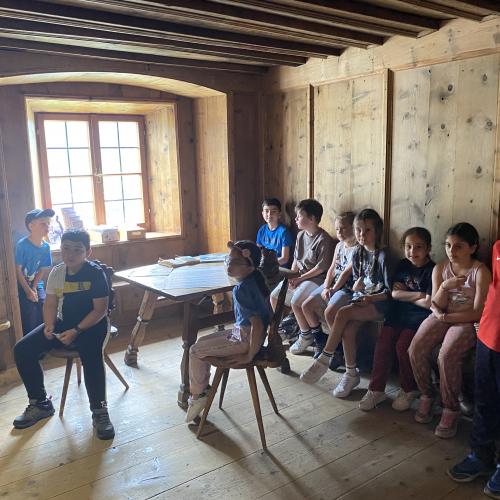 Nach einem Marsch durch strömenden Regen erreichten wir hungrig das Schloss. Wir durften in der Gotischen Halle jausnen und machten uns dann auf, um das Schloss zu besichtigen. Wir besuchten den religiösen Raum, schauten nach welchen Namen wir in früherer Zeit bekommen hätten. Dann ging‘s weiter ins Richterzimmer, zu den Schützen und warfen dort einen Blick durchs Plumpsklo ins Freie.?Dann besuchten wir noch mehrere Bauernstuben und hörten von der Tragödie der Schwabenkinder. Die Krippe durfte natürlich auch nicht fehlen. Das Highlight war der Ausblick vom Turm. Ein tolles Erlebnis.