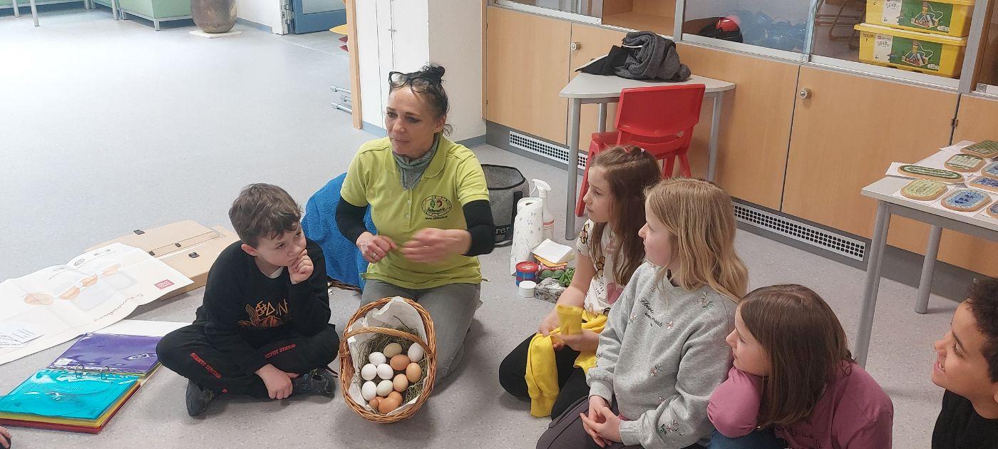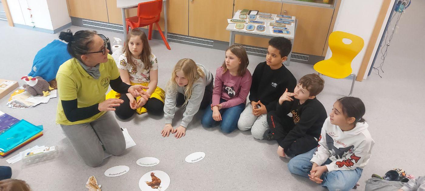 Gemeinsam gingen wir der berühmten Frage nach: Was war zuerst da – die Henne oder das Ei? Außerdem lernten die Schülerinnen und Schüler die Güteklassen von Eiern und verschiedene Hühnerarten kennen.