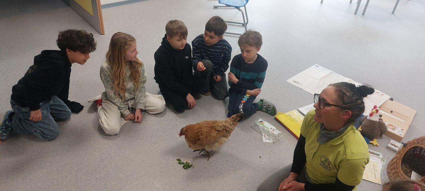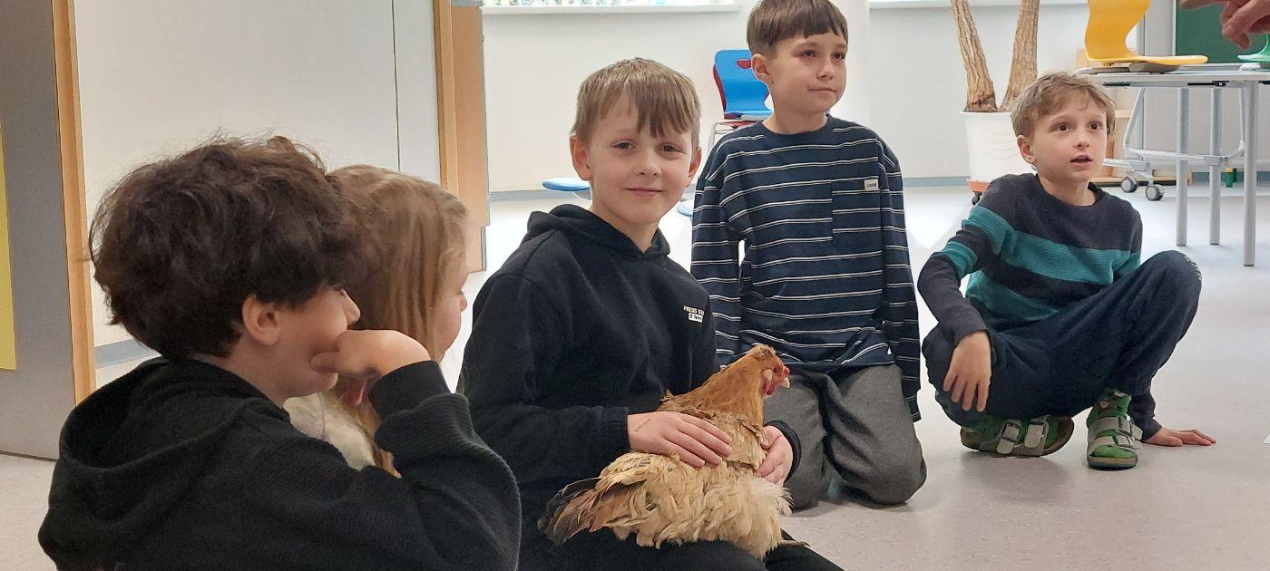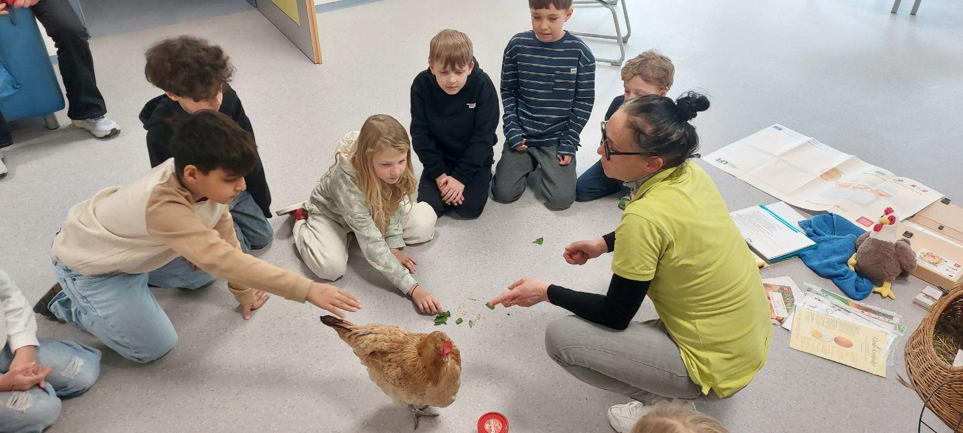 Heute hatten wir einen besonderen Besuch in der 3. Stufe: Bäuerin Burgi Grissemann kam gemeinsam mit ihrer Henne Henrietta in die Klasse. Die Kinder erfuhren viel Spannendes rund um das Thema Huhn und Ei.