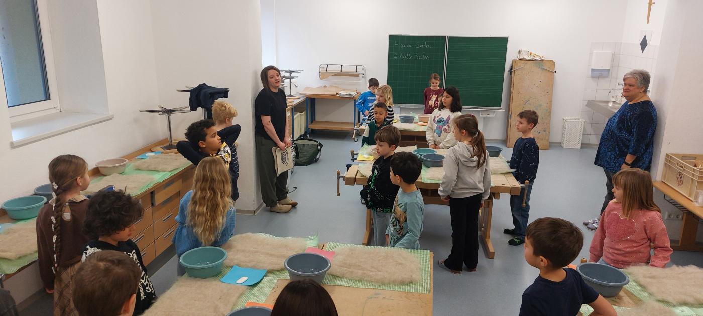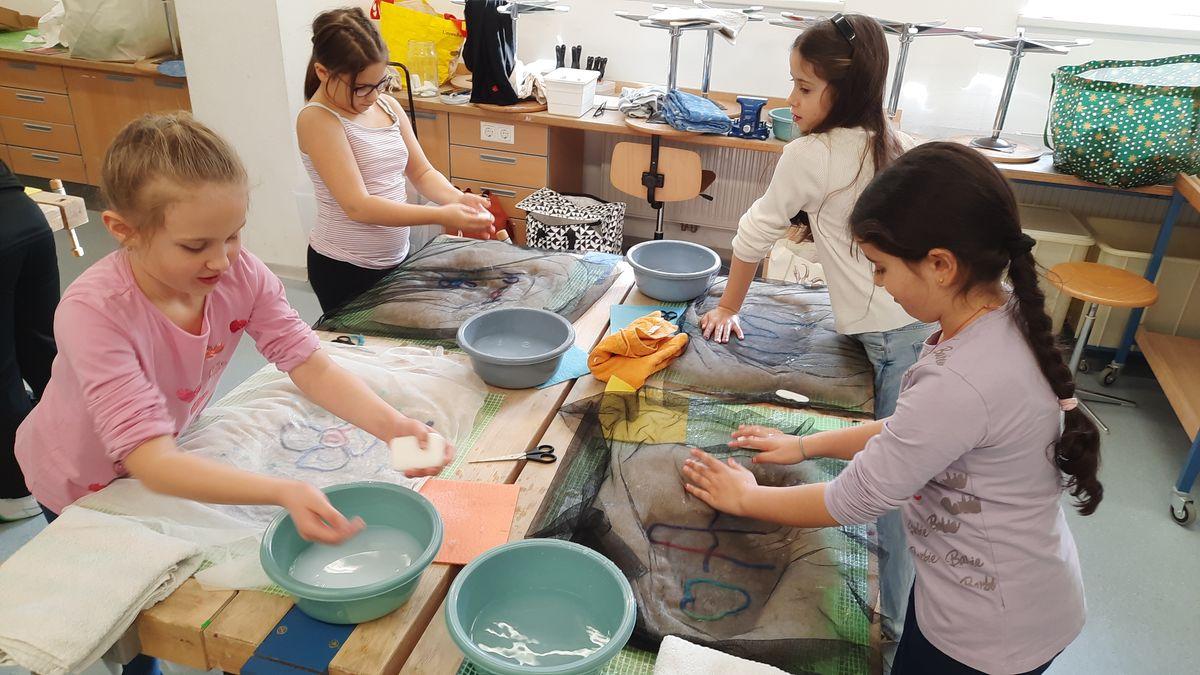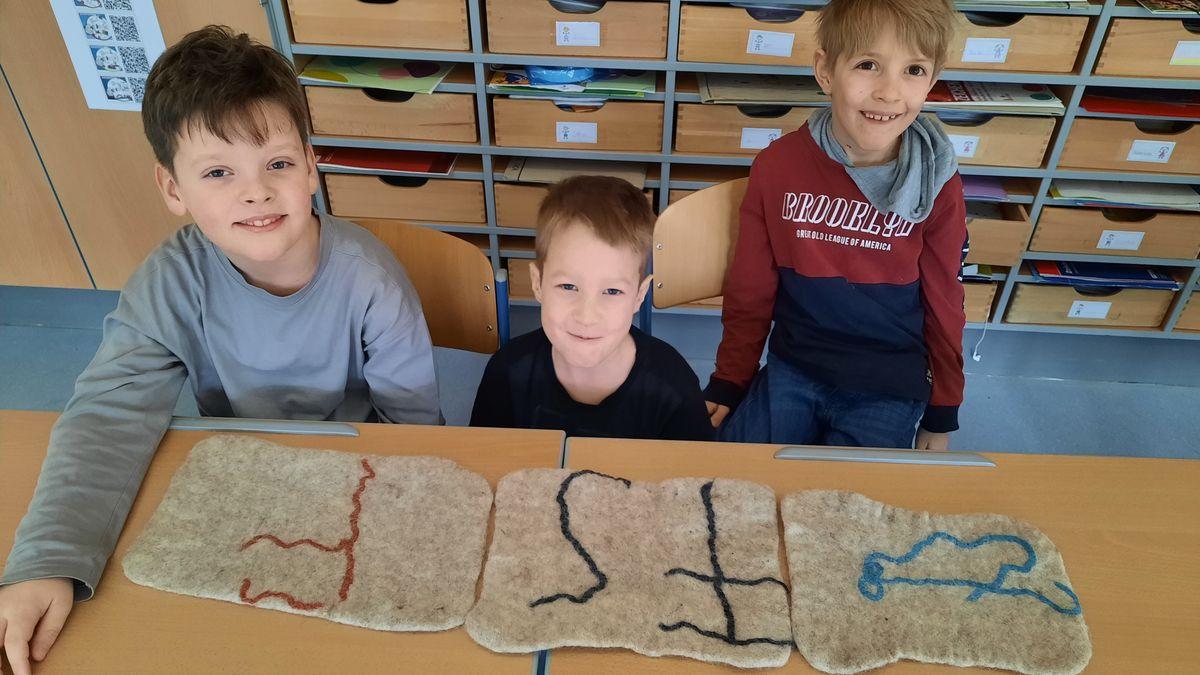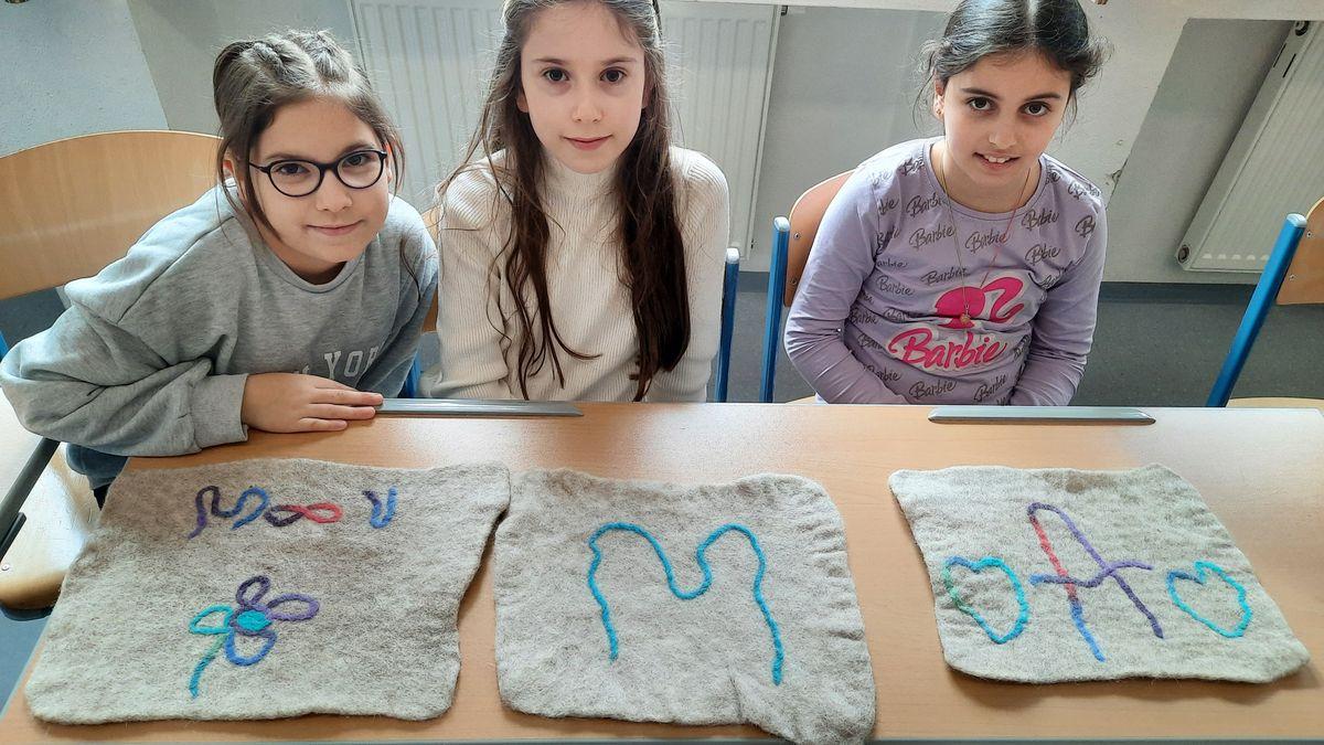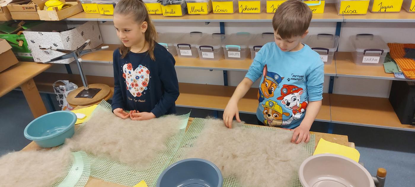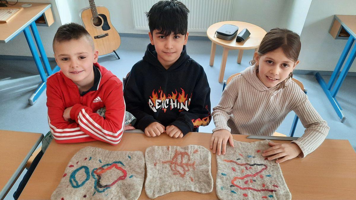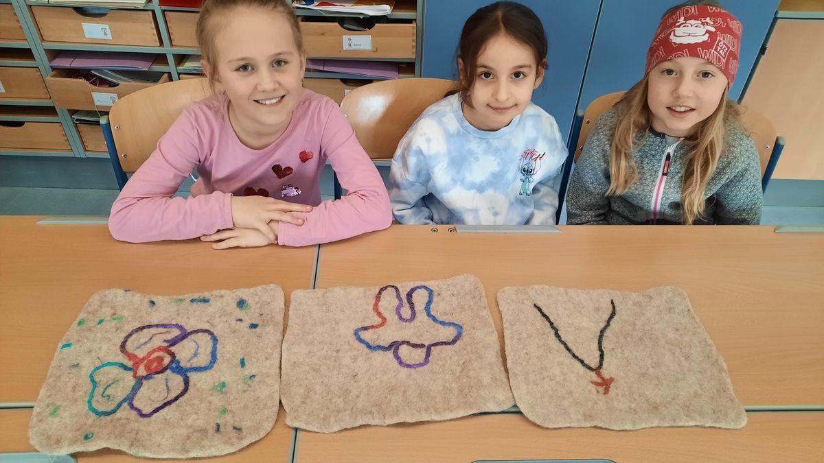 Am Dienstag, den 25. Februar besuchte uns Marlena Strauß, um mit den Kindern eine Sitzunterlage zu filzen. Dazu bekam jedes Kind ein vorbereitetes Stück Schafwollvlies und verschiedene Fäden, um die Sitzunterlage mit einem Muster zu verzieren. Mit viel Wasser und Seife wurde anschließend die Sitzunterlage vorsichtig gefilzt. Immer wieder bekamen die Kinder Tipps und Tricks von Marlena, damit ihr Sitzfleck zu einem Kunstwerk wurde. Der Kreativität waren fast keine Grenzen gesetzt. Die Kinder hatten sichtlich Spaß und präsentierten voller Stolz ihre Sitzunterlage.