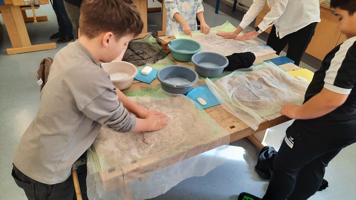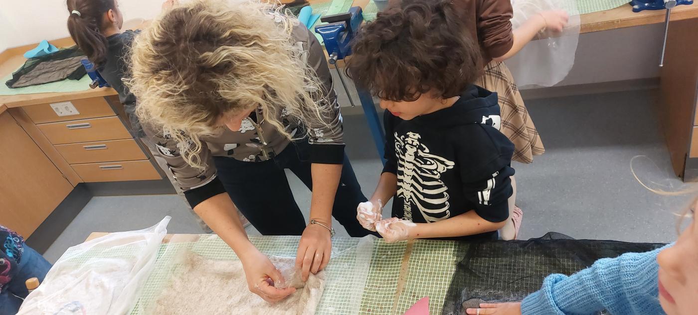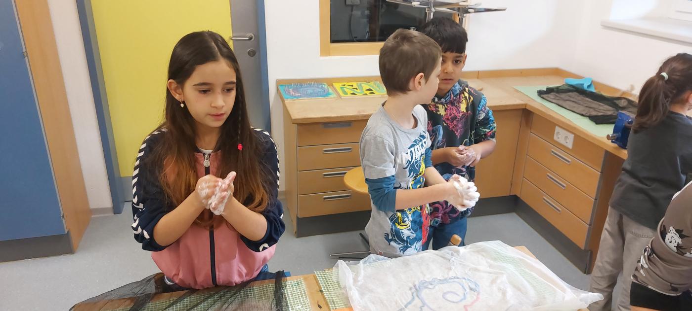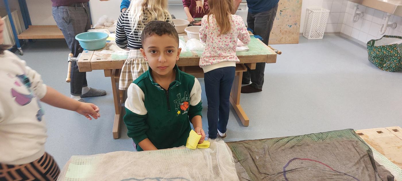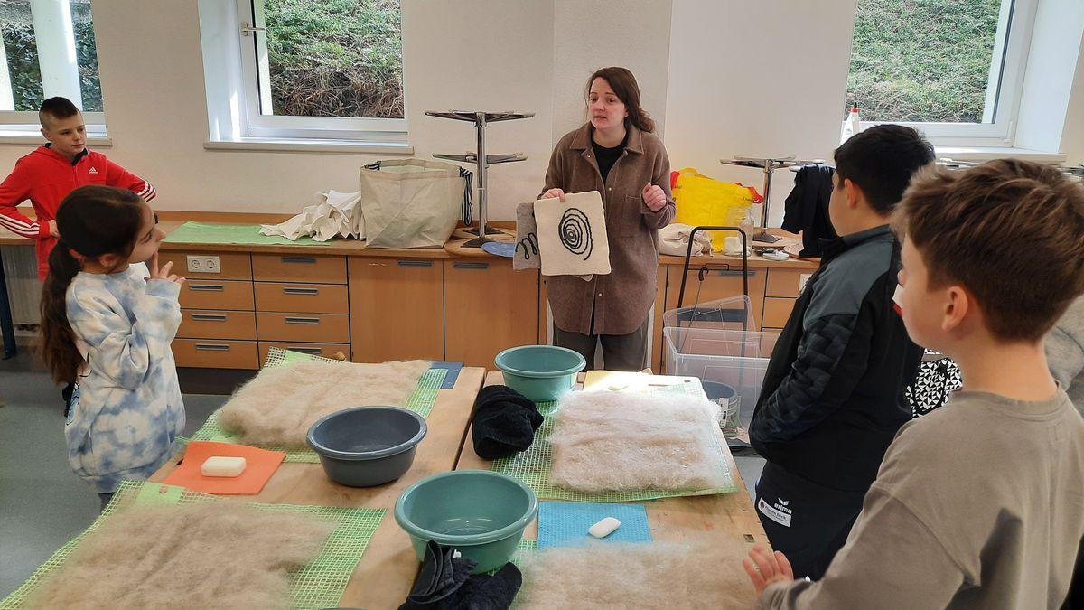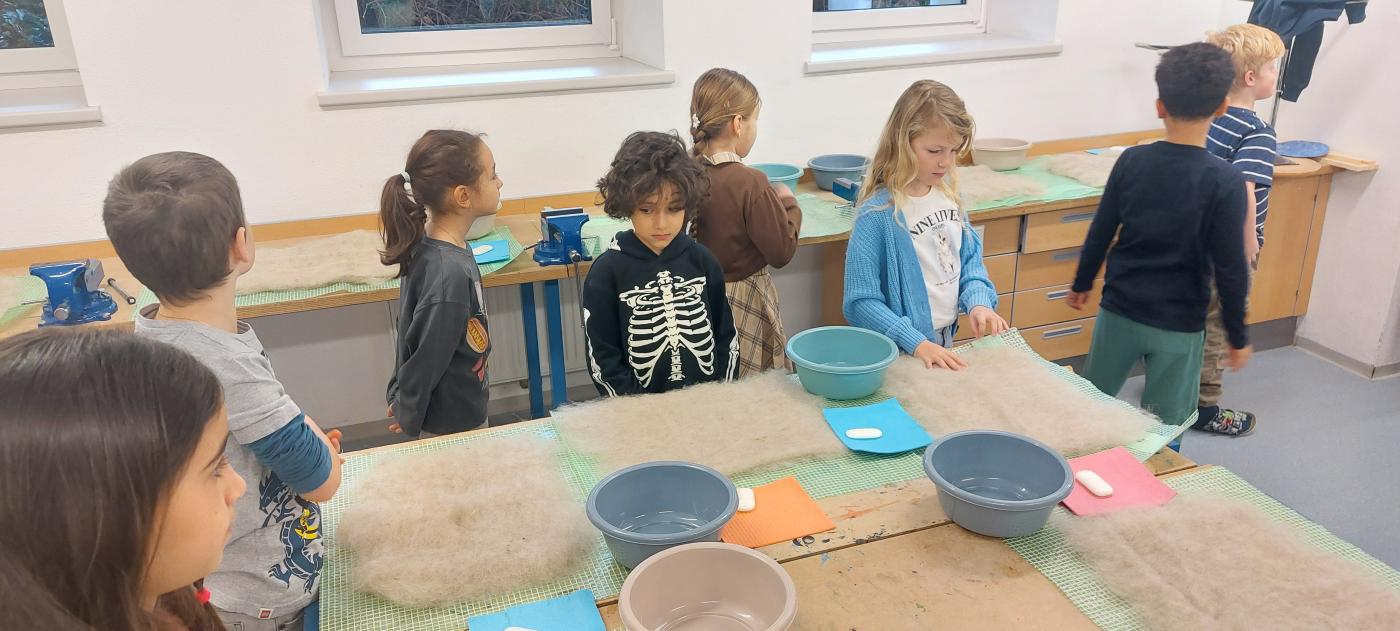 Am Dienstag, den 25. Februar besuchte uns Marlena Strauß, um mit den Kindern eine Sitzunterlage zu filzen. Dazu bekam jedes Kind ein vorbereitetes Stück Schafwollvlies und verschiedene Fäden, um die Sitzunterlage mit einem Muster zu verzieren. Mit viel Wasser und Seife wurde anschließend die Sitzunterlage vorsichtig gefilzt. Immer wieder bekamen die Kinder Tipps und Tricks von Marlena, damit ihr Sitzfleck zu einem Kunstwerk wurde. Der Kreativität waren fast keine Grenzen gesetzt. Die Kinder hatten sichtlich Spaß und präsentierten voller Stolz ihre Sitzunterlage.