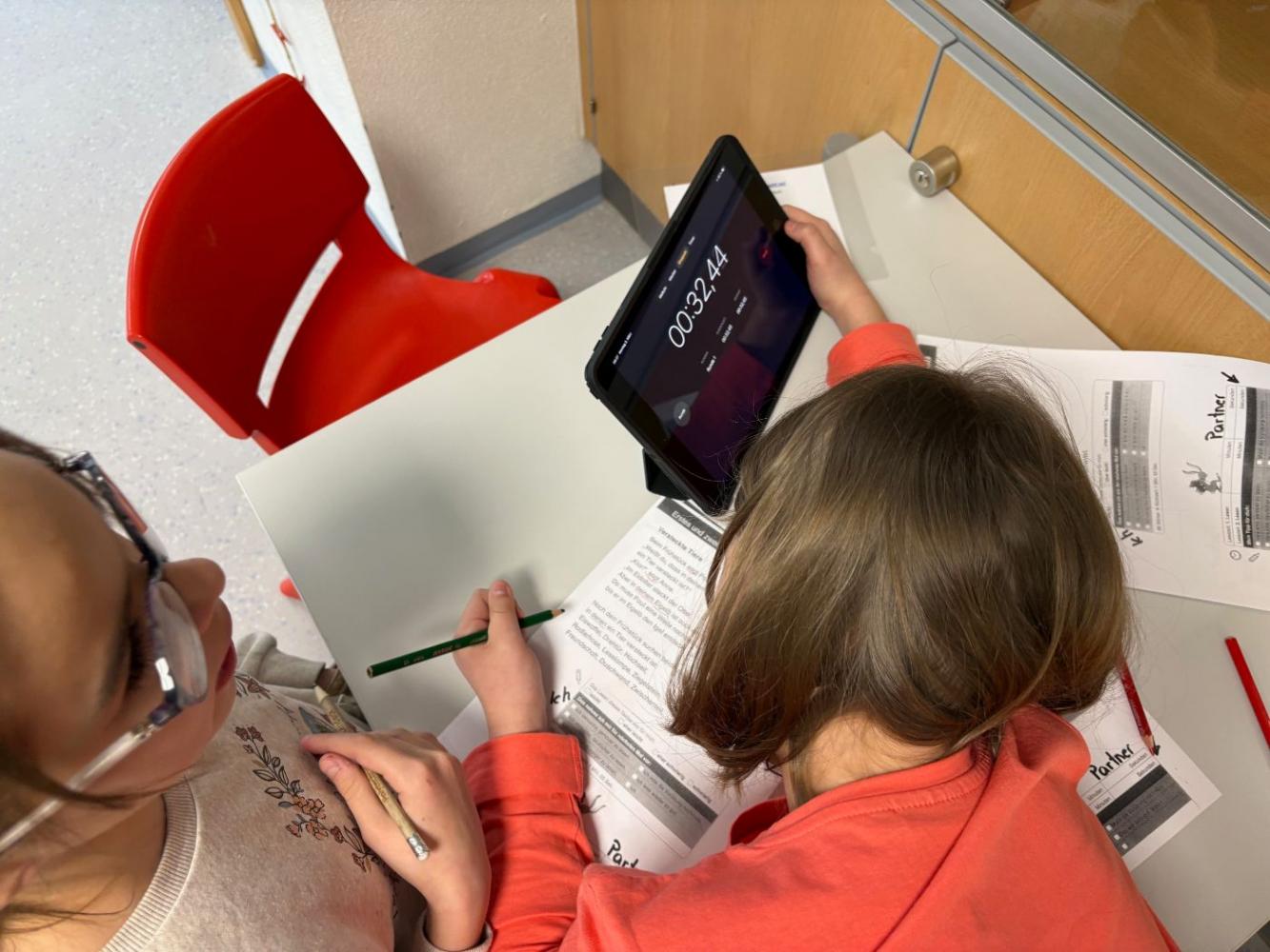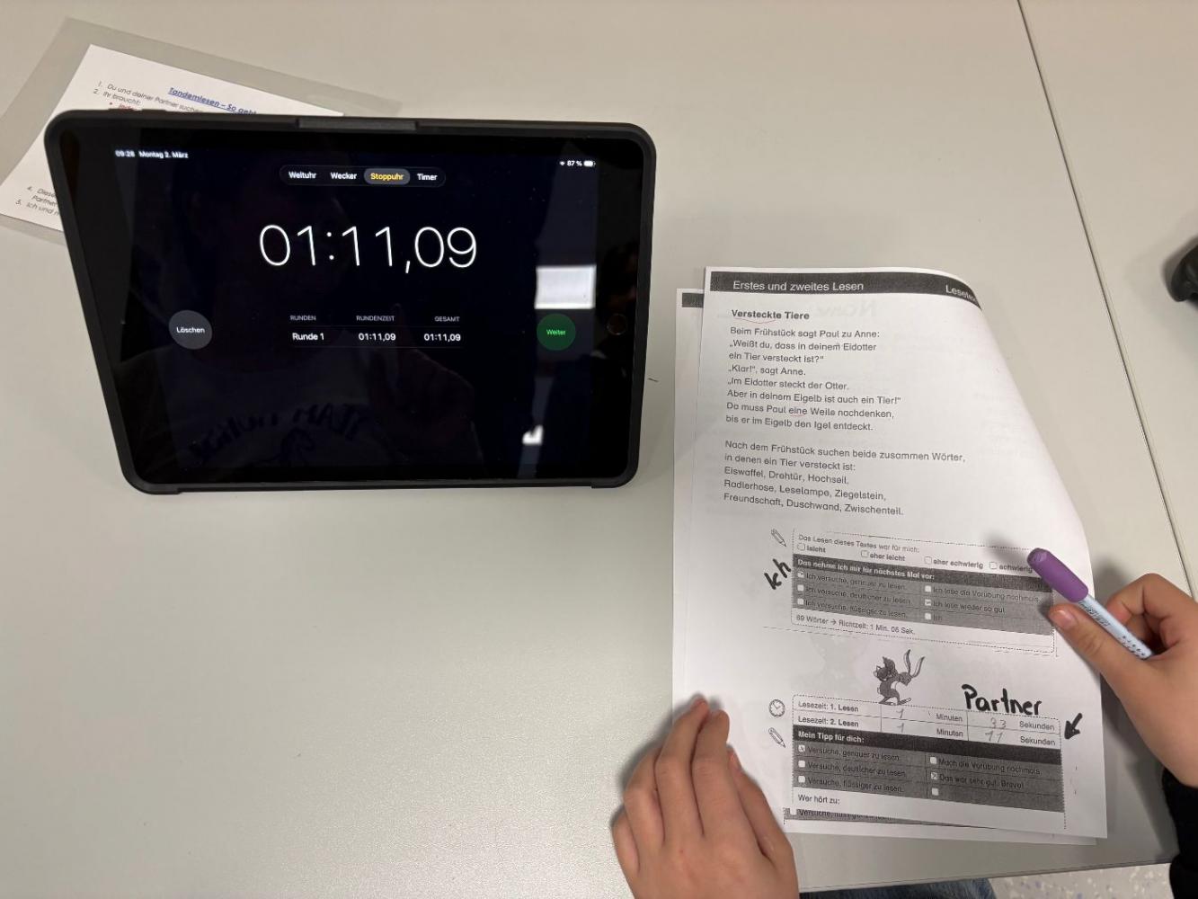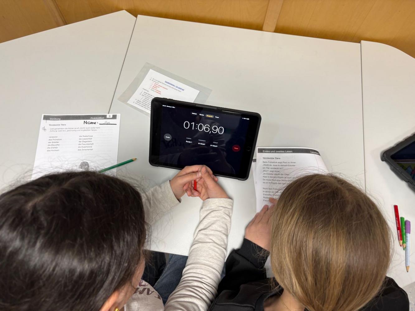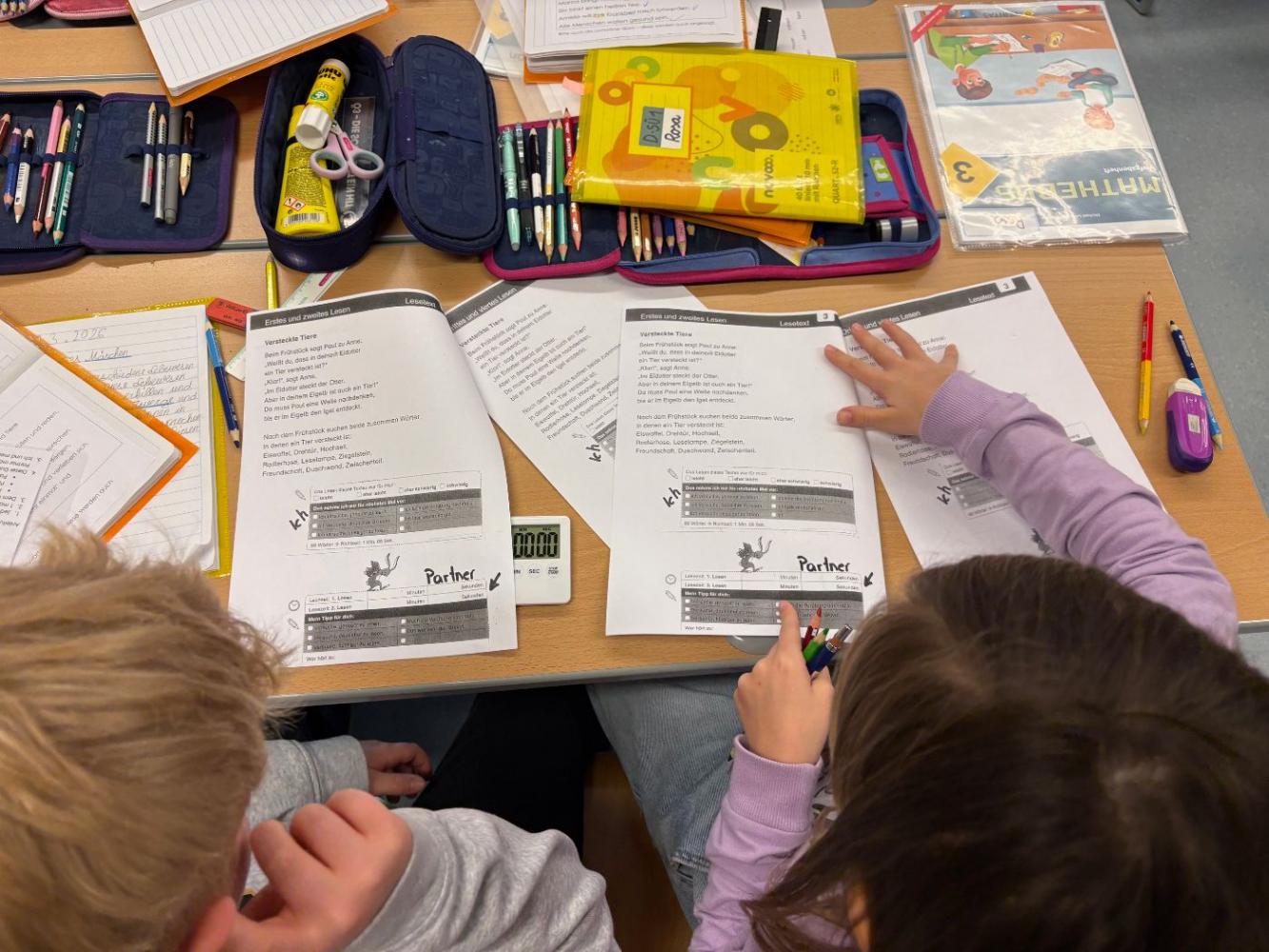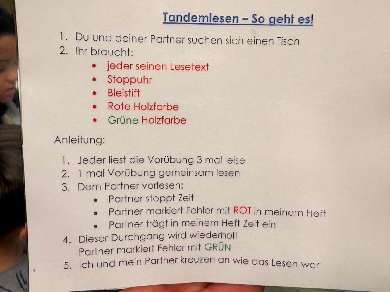 Bei uns an der Schule treffen sich die Schülerinnen und Schüler der 3. und 4. Schulstufe regelmäßig zum Tandemlesen. Dabei lesen jeweils zwei Kinder gemeinsam einen Text. Anschließend liest ein Kind den Abschnitt erneut, während das Partnerkind die Zeit stoppt. Darauf folgt eine wertschätzende Selbst- und Fremdeinschätzung des Lesevortrags. Beim nächsten Treffen werden die Rollen getauscht.
